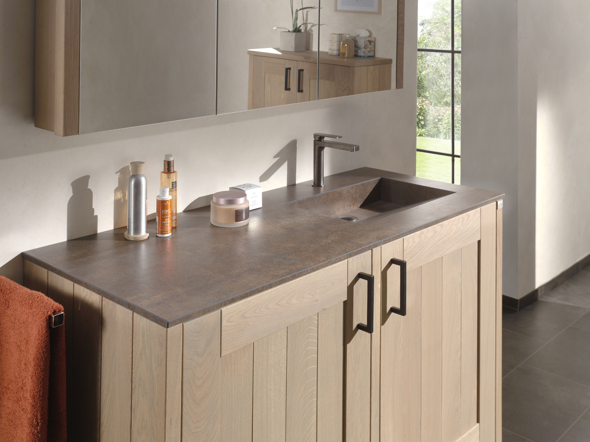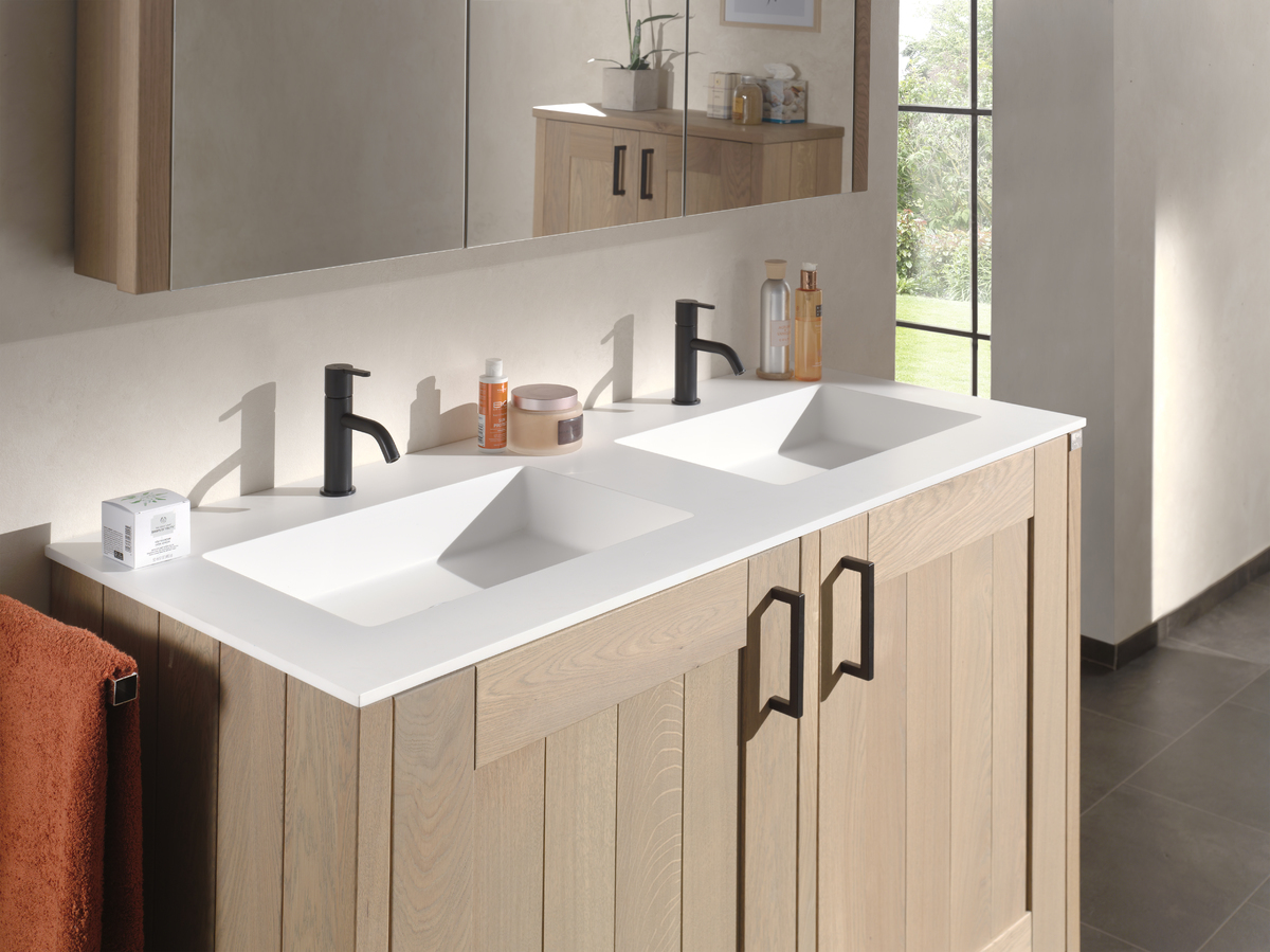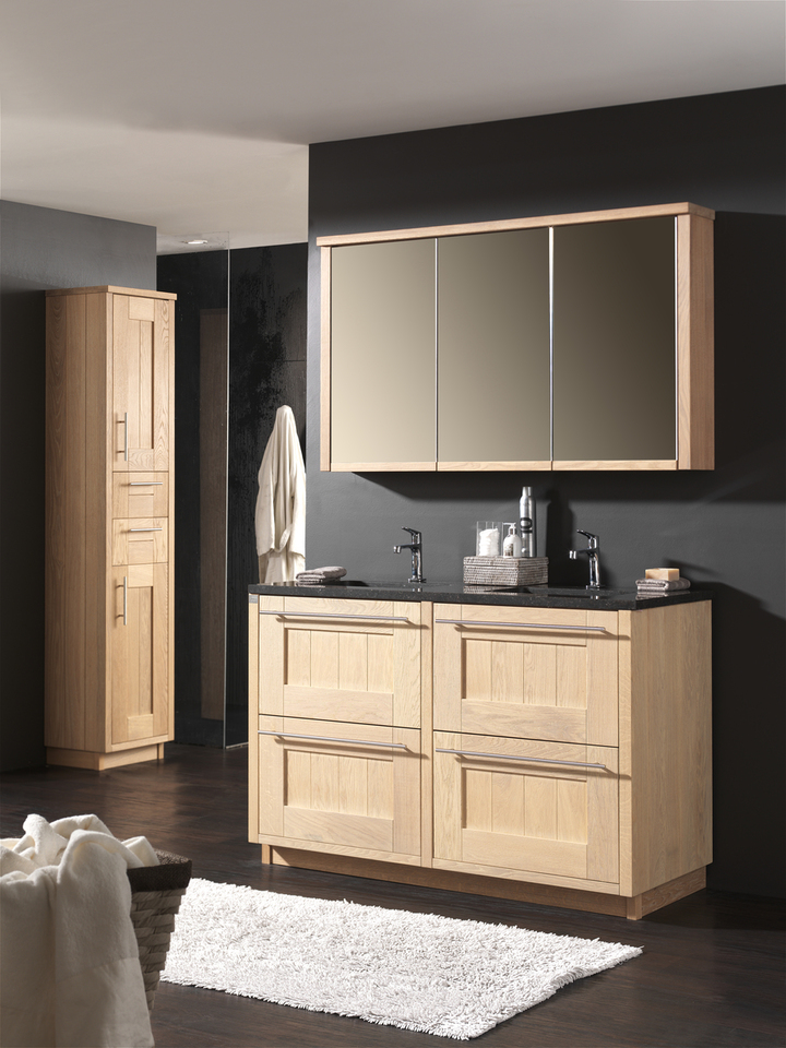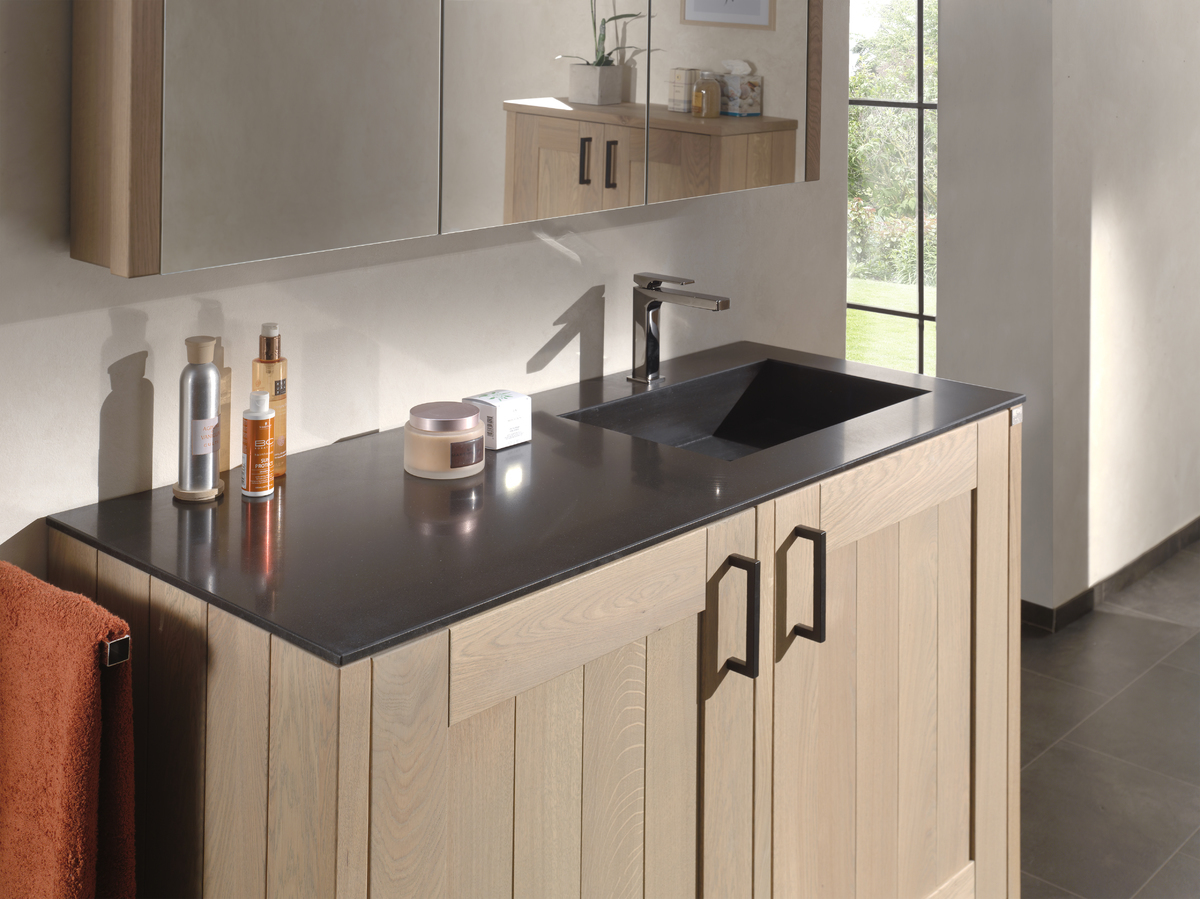Squadra staat voor flexibiliteit en robuuste vormen. Dit badkamermeubel laat u toe verschillende elementen met elkaar te combineren. Met niet minder dan twaalf mogelijke combinaties valt dit meubel bij iedereen in de smaak. De eikenhouten latten zorgen voor de nodige symmetrie en rust, terwijl de combinatie met het natuurstenen blad het geheel afwerkt.
